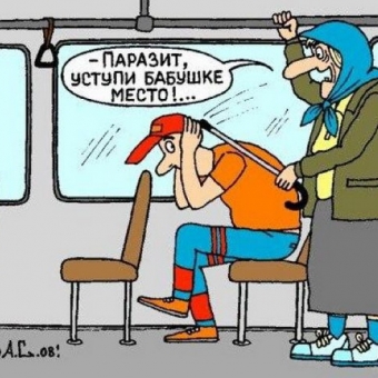 Дедушка в автобусе стоит,